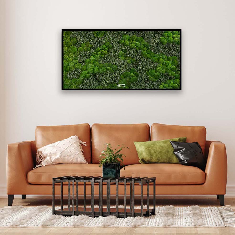 Moosbild – Terra schafft eine angenehme natürliche Kombination aus Flachmoos und Kugelmoos. Sie können aus Moosbild – Terra in verschiedenen Größen wählen.
