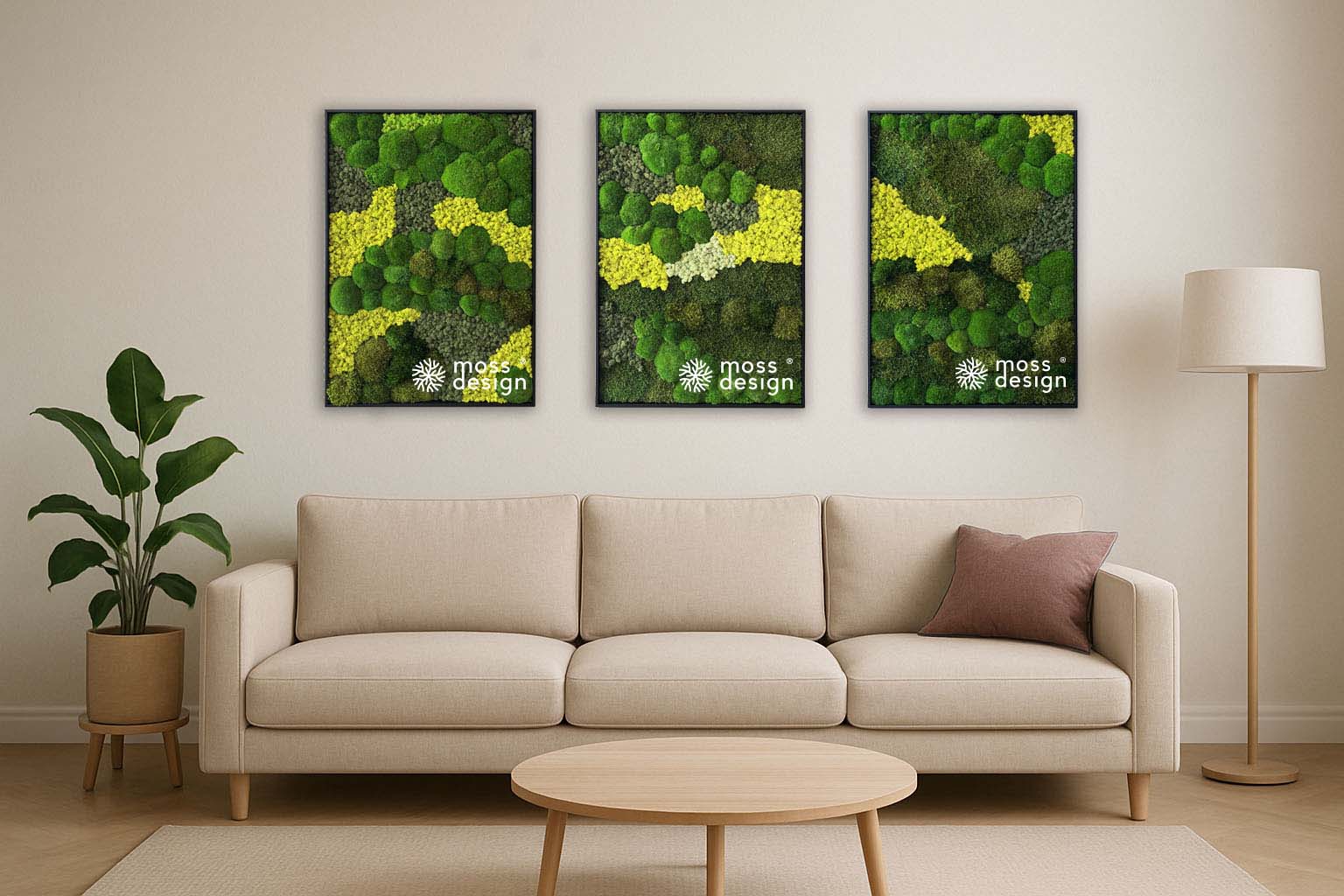 Es kann mit anderen Moosbildern aus der VERDANT-Serie oder mit den Moosbildern VERDANT BETA oder VERDANT GAMA kombiniert werden. In großen Räumen und an Wänden mit größeren Abmessungen kommt es am schönsten in einer 3er-Kombination zur Geltung als