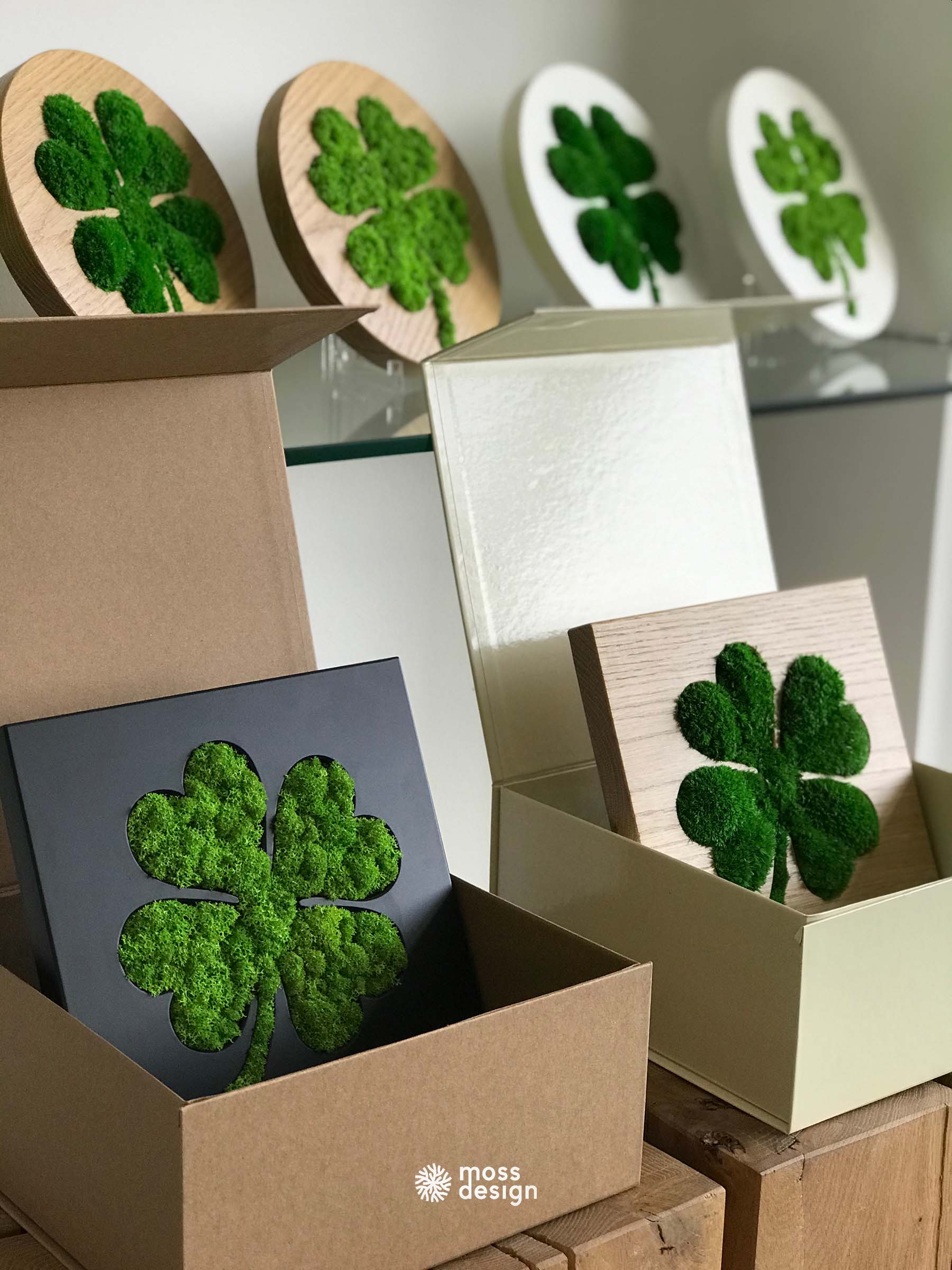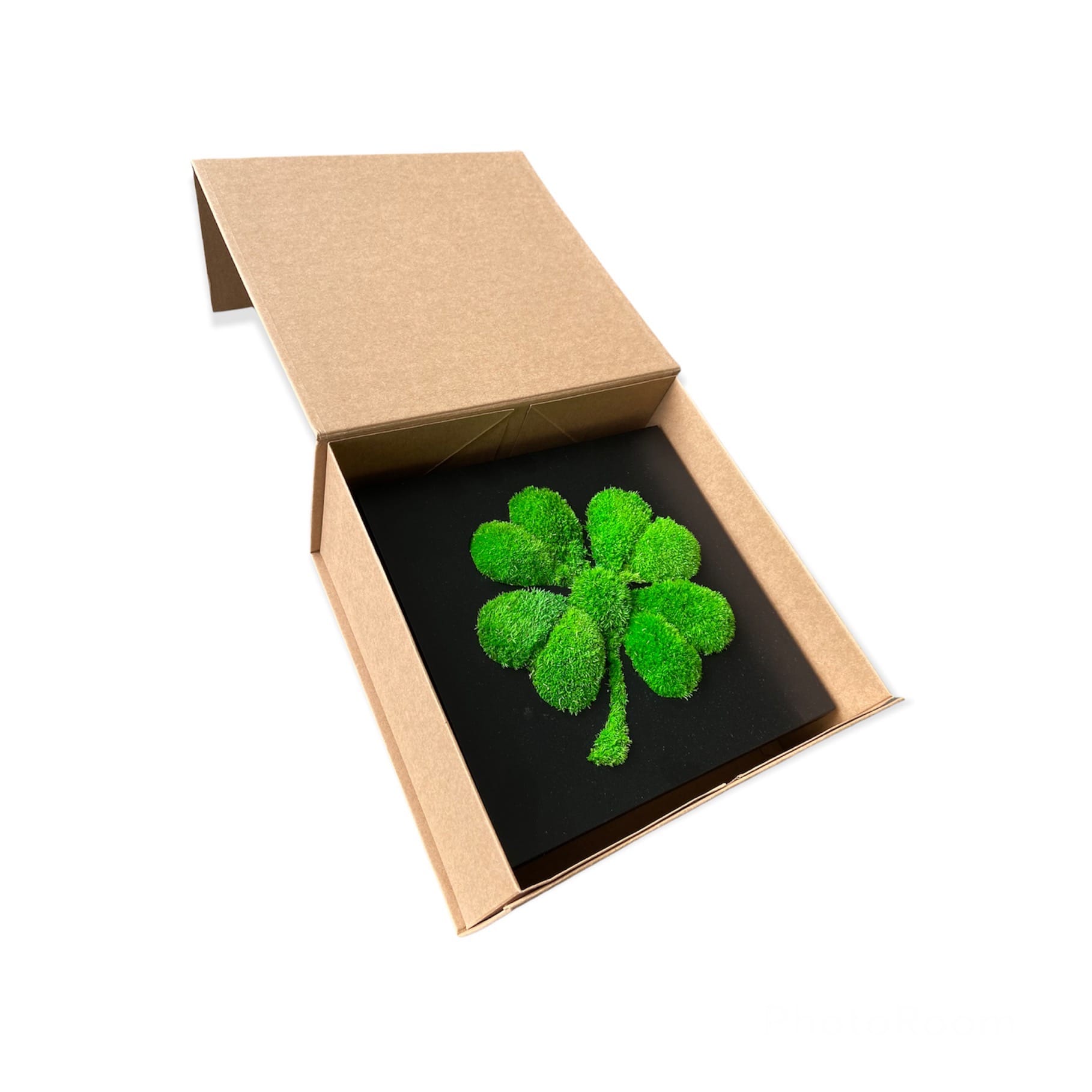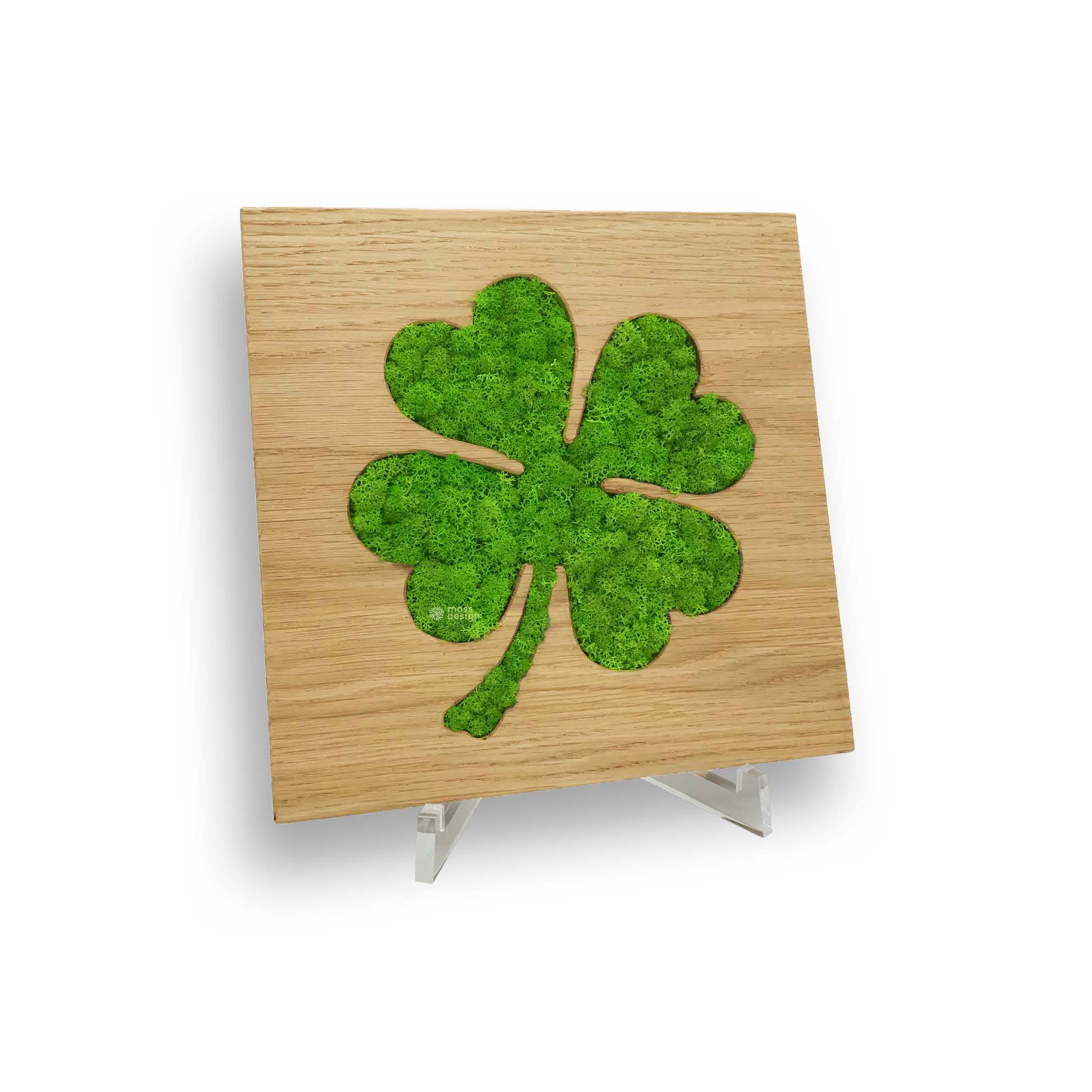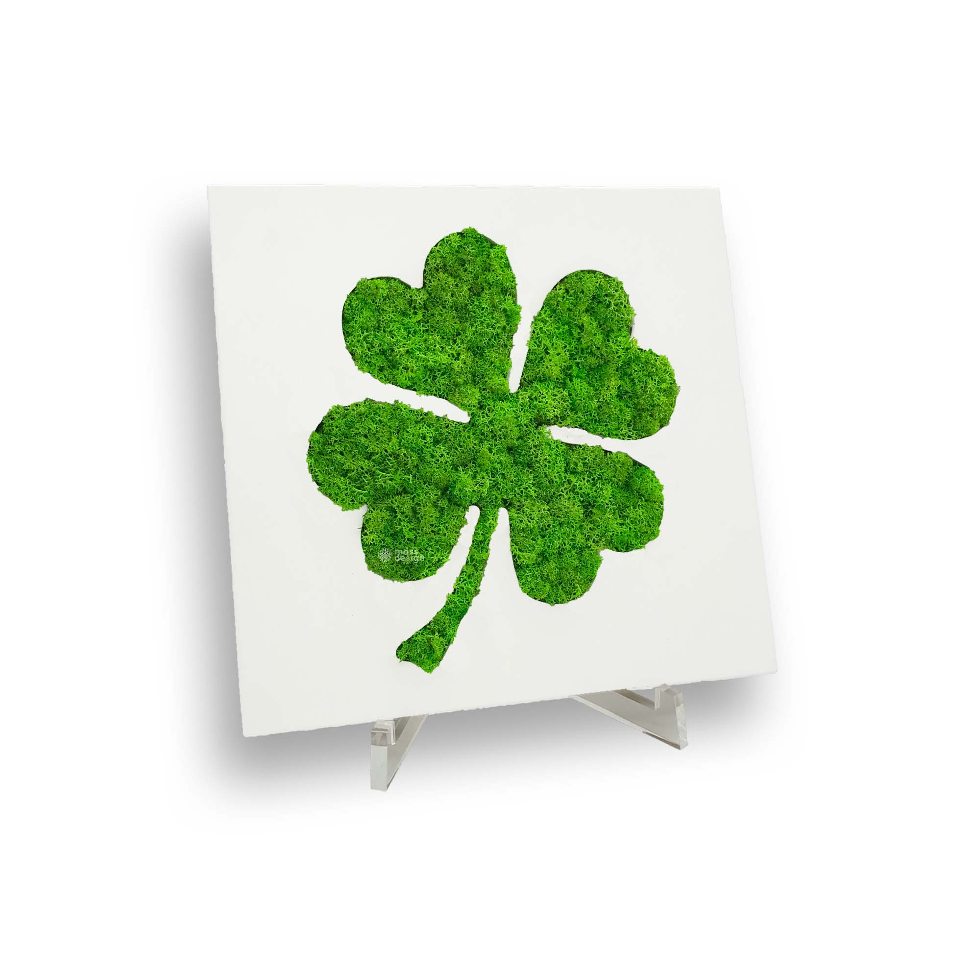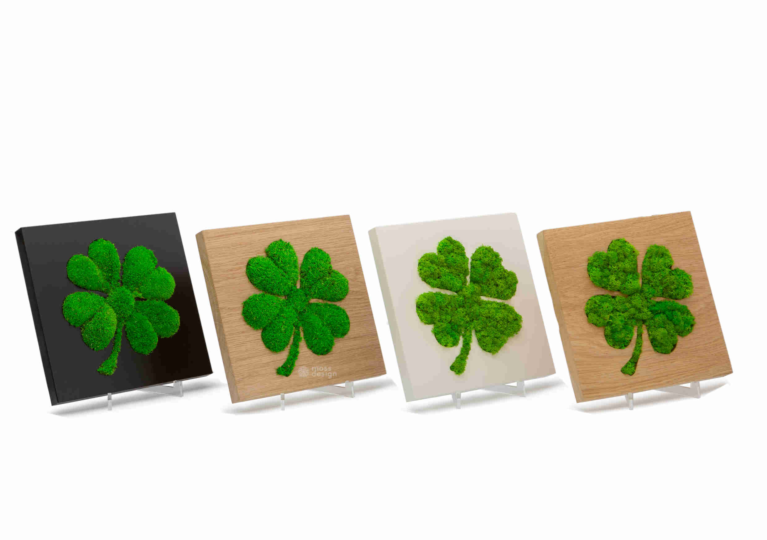 Das quadratische vierblättrige Kleeblatt aus Moos der nordischen Flechten kommt auf einem schwarzen, weißen oder eichenen Hintergrund wunderbar zur Geltung. Dank der feinen Textur des Mooses und der wunderschön leuchtend grünen Farbe hebt es sich visuell vom Bild ab und verleiht ihm eine ganz neue Dimension. Das vierblättrige Kleeblatt wird leere Regale in Ihrer Wohnung aufhellen.