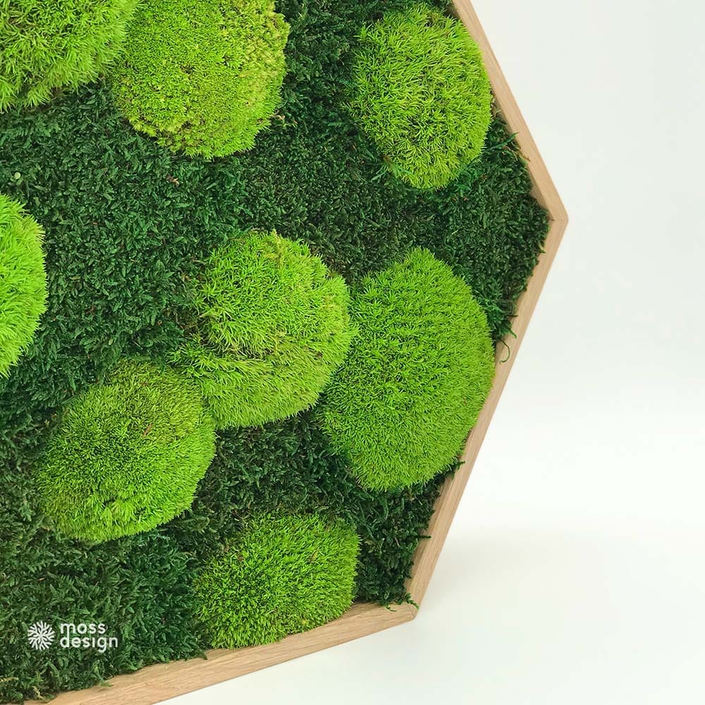 Das Moos Sechseck ist ein originelles Gestaltungselement, mit dem Sie verschiedene interessante Kompositionen an der Wand schaffen können. Sie können das Kugelmoos in einem weißen, schwarzen oder farbigen sechseckigen Rahmen bestellen. Seien Sie kreativ und gestalten Sie ein einzigartiges Mosaik mit mehreren Rahmen nach Ihrem Geschmack.