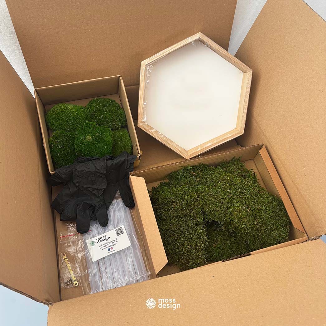 Das DIY SET – Sechseck Kugelmoos und Flachmoos enthält alles, was Sie brauchen, um Ihr eigenes Moosbild zu malen.
